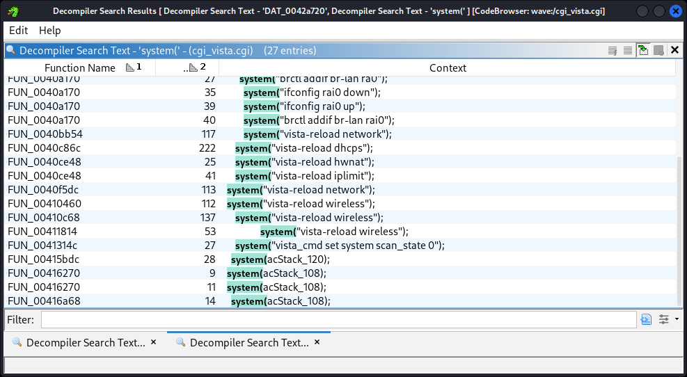 Searching for “system(“ in the decompiled code yielded quite a few results.