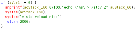The logic took a time-zone string from user input and echoed it to /etc/TZ. The issue was that user input was not sanitized, and the string was directly used to construct a system command. I could inject arbitrary shell command by providing a string in the form of ';<cmd>', which would result in system("echo '';<cmd>''> /etc/TZ"), making it a classic command injection vulnerability.