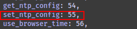 From my earlier front-end code analysis, I discovered a list of API endpoint definitions in /www/static/js/main~29d6ecf2.f44bc14e.chunk.js. From this, I determined that the command ID for setting NTP was 55.