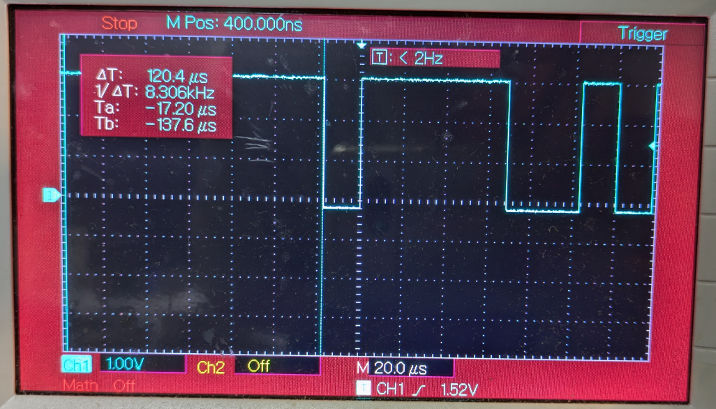 Once the device was powered on, the oscilloscope captured a digital waveform on Pin 2, suggesting it as the TX pin. The measured bit width was 17.20 µs, which translates to approximately 58,139 bits per second. The closest standard baud rate is 57,600, which I used for later connections.